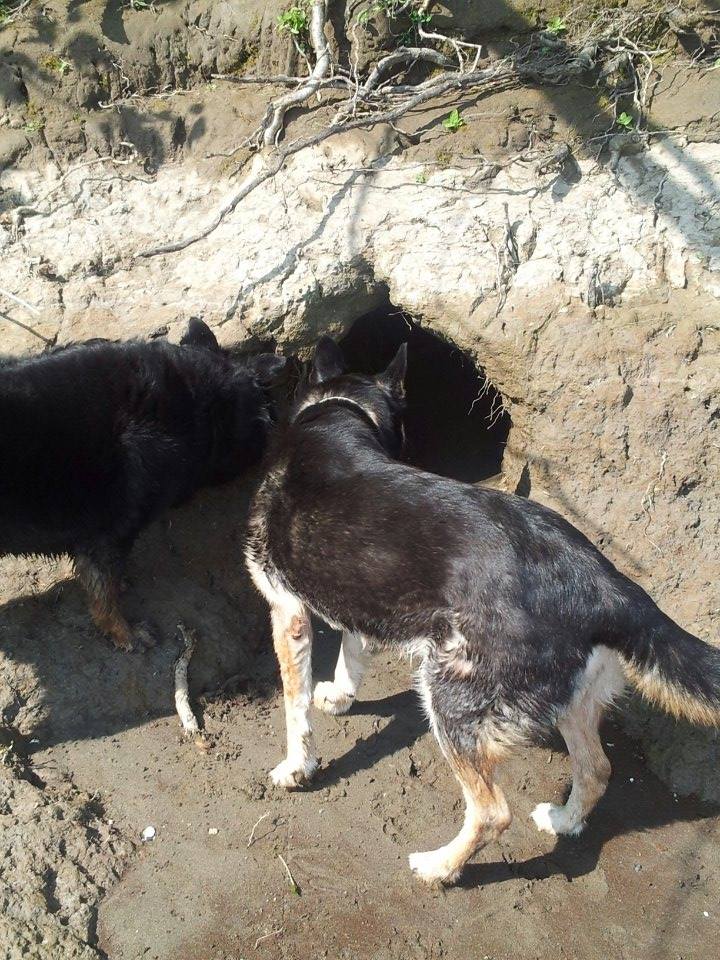 -Happy pups exploring a cave in the river bank. Inca (on the right) went all the way through. :)-