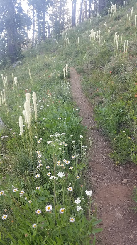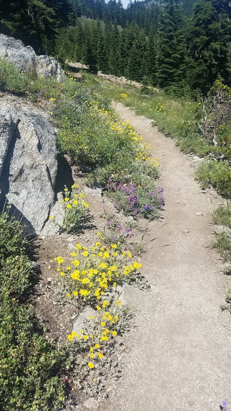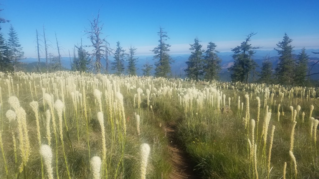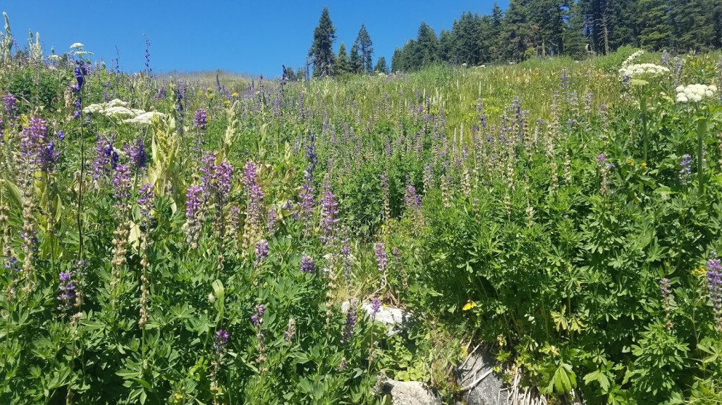 We hoped to be on the trail by 7:30 a.m. to beat the heat, as today would offer little shade, according to my book. We started hiking at 7:50 a.m., and had to take layers off by the time we hit the PCT, half a mile from camp. The day was beautiful, and I was SO beyond happy I didn’t skip this section of Oregon. The wildflowers were otherworldly. We saw a few day hikers today, and the locals told us we really lucked out with the flowers, it was the best display they had seen in years.
