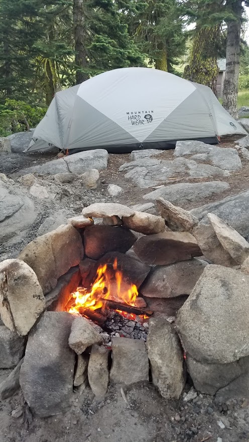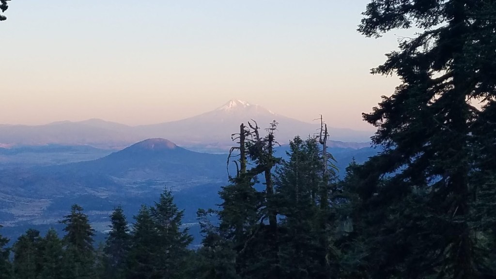 The campground is beautiful with a view of Mt. Shasta and the whole valley in one direction, and Mt. Ashland in the other. However, it was incredibly windy, therefore very cold. There was firewood and kindling left in our site, so Carl got a small fire going for us to enjoy while we ate our ramen and bibimbap backpacker meal.