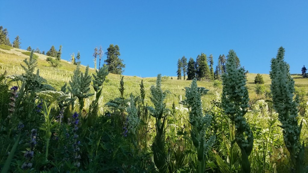 Carl and I snagged a wonderful spot with a great view next to a meadow full of wildflowers. This was one of my favorite nighttime locations on the whole trail, and one of my favorite evenings; probably because Carl was with me. Hiking with him was fun, and he made me feel safe. I was nervous I’d be facing the trail alone soon. Not only was I nervous about sleeping in the middle of nowhere all alone, I was nervous about carrying all my gear. With Carl, the weight was shared between the two of us, and my pack already felt so heavy.